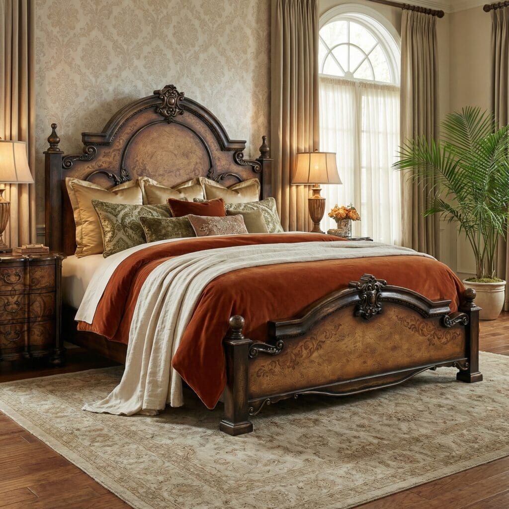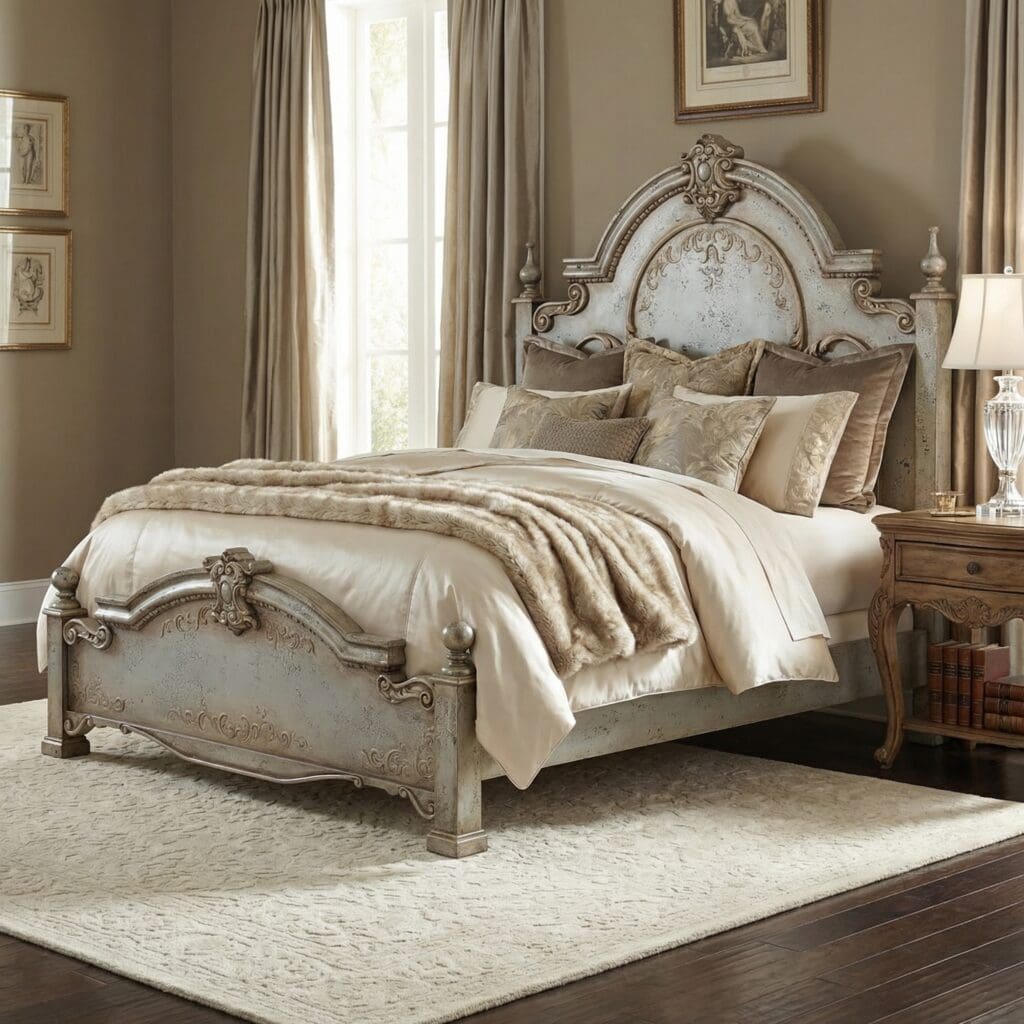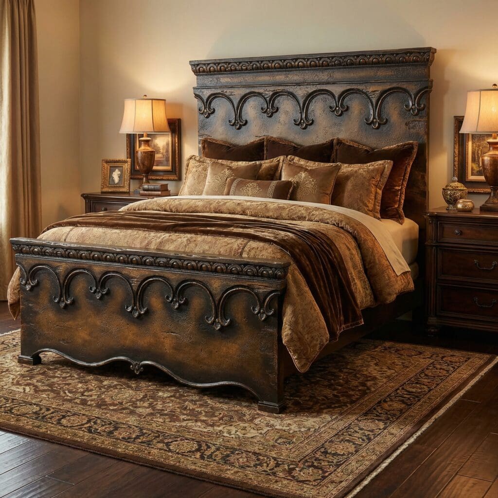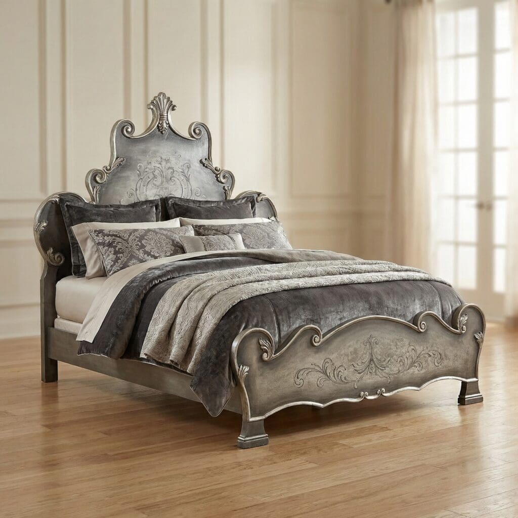 Marqueza Carved Wood King Bed with Ornate Headboard – Silver Copper Finish