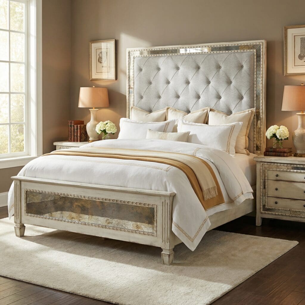 Madeleine Wood King Bed with Tufted and aged glass Headboard