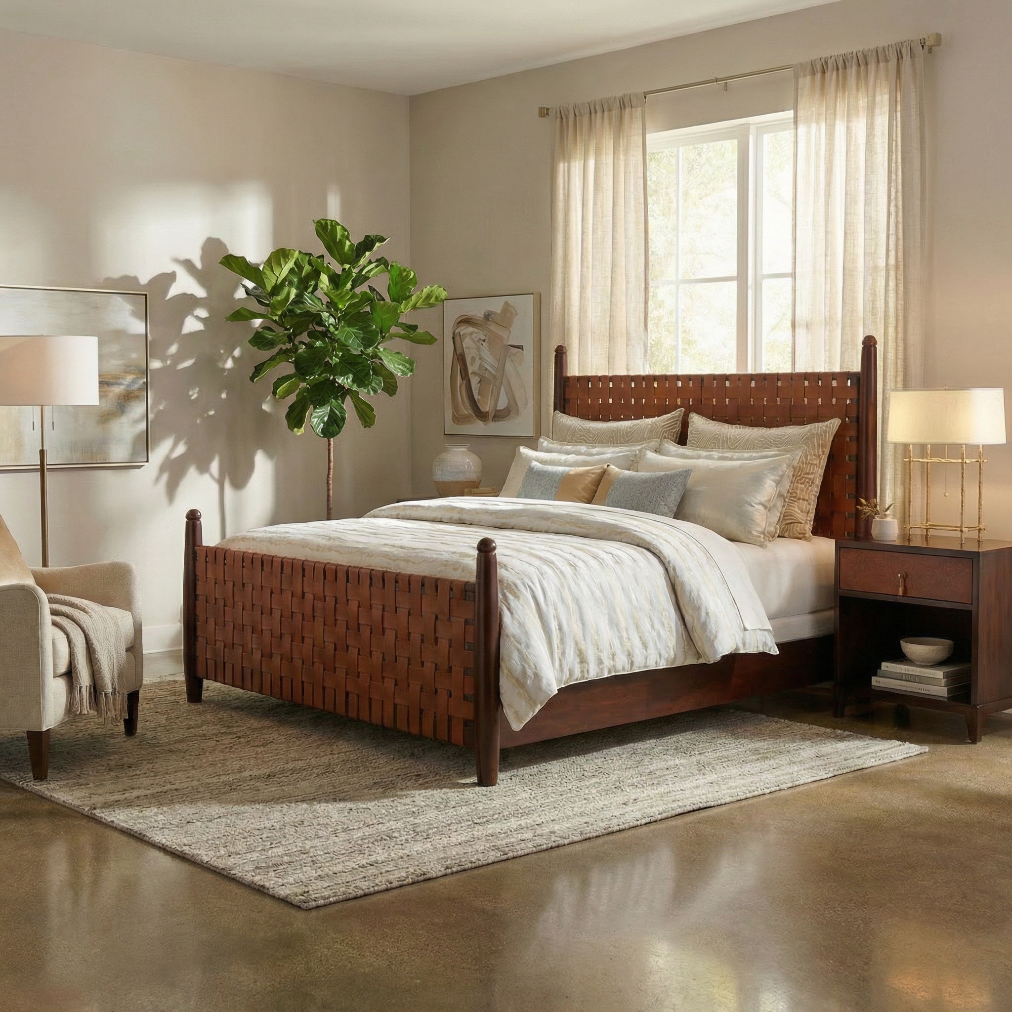 The Ariel Leather Bed is a statement of understated luxury, thoughtfully handcrafted for those who appreciate exceptional materials and enduring design. Its distinctive headboard and footboard showcase meticulously hand-woven leather panels, creating rich texture and visual depth while maintaining a clean, timeless silhouette.