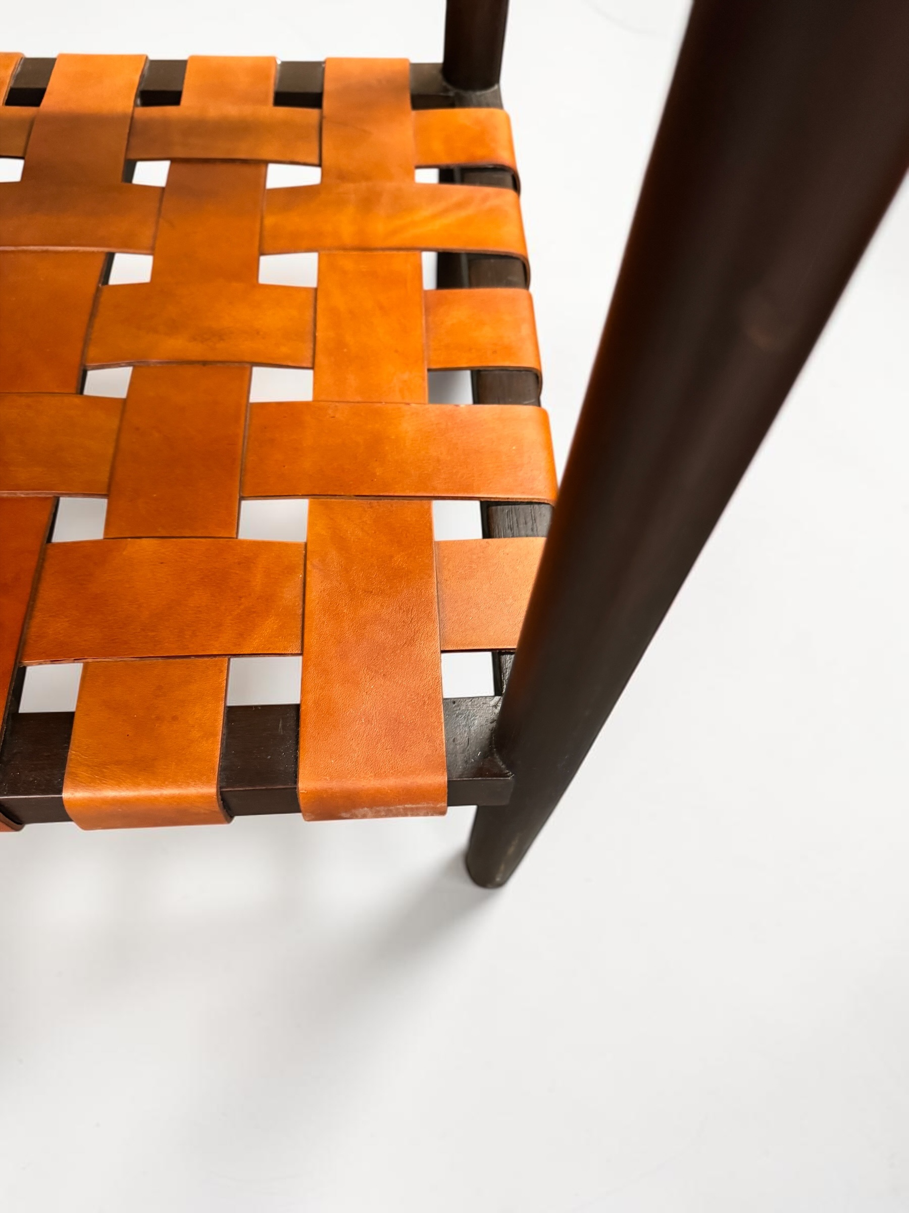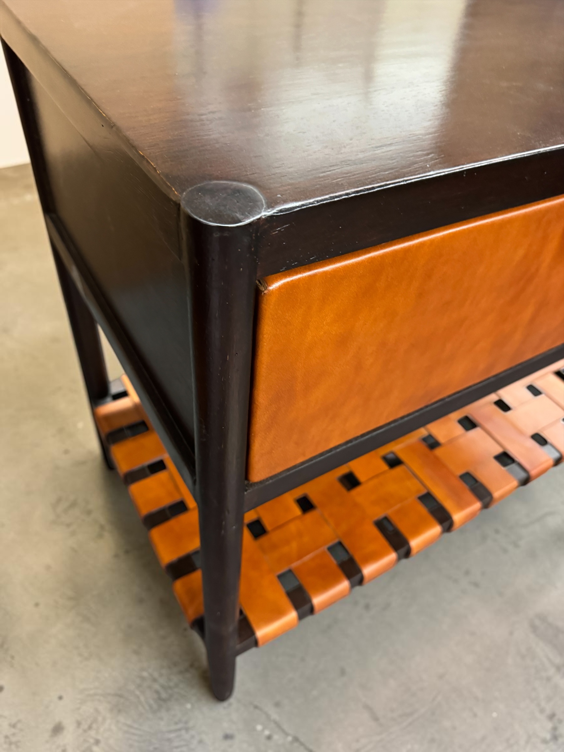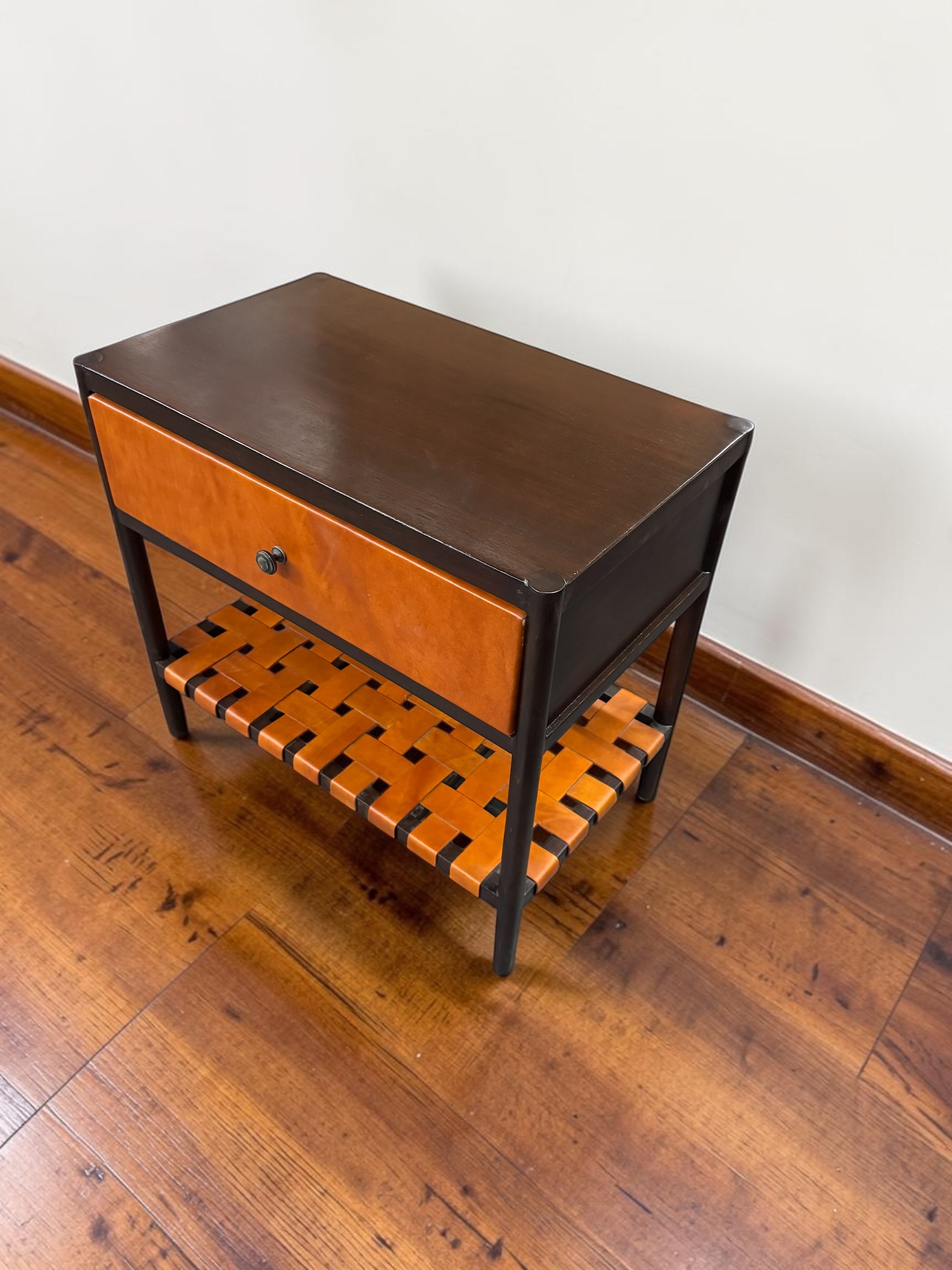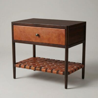 Upgrade your bedroom with the Ariel Leather Nightstand, a stunning blend of modern rustic design and artisan craftsmanship. This handmade wood nightstand features a cognac leather front drawer and a woven leather shelf, making it a sophisticated yet functional addition to your space.