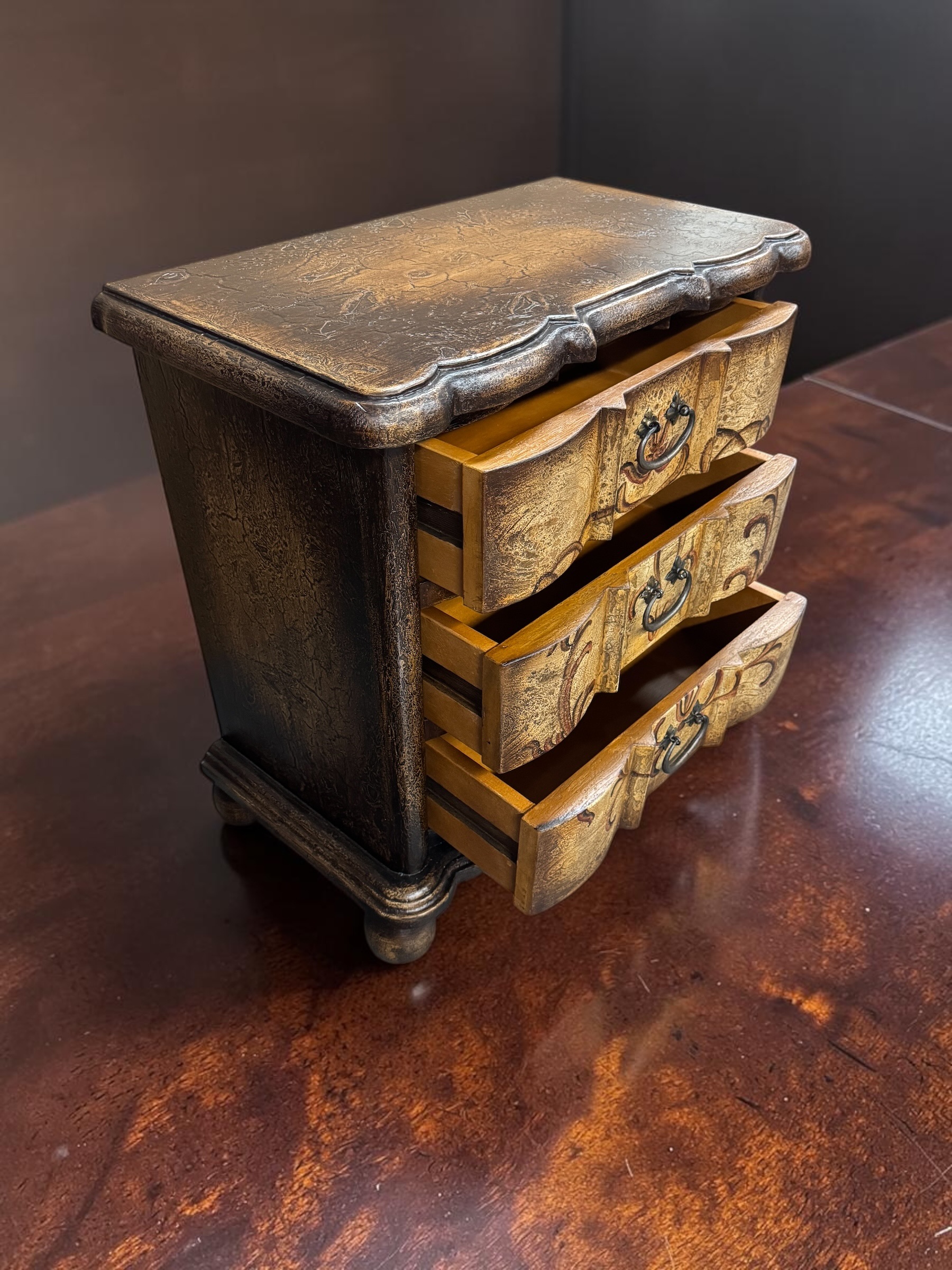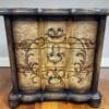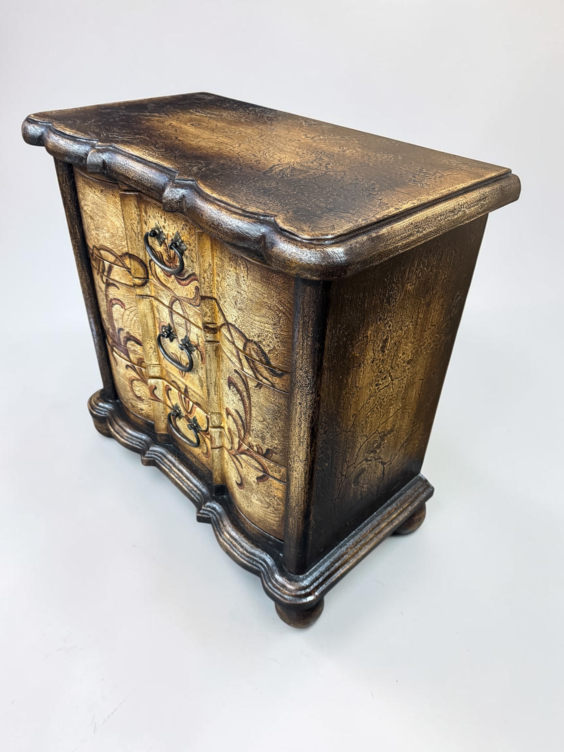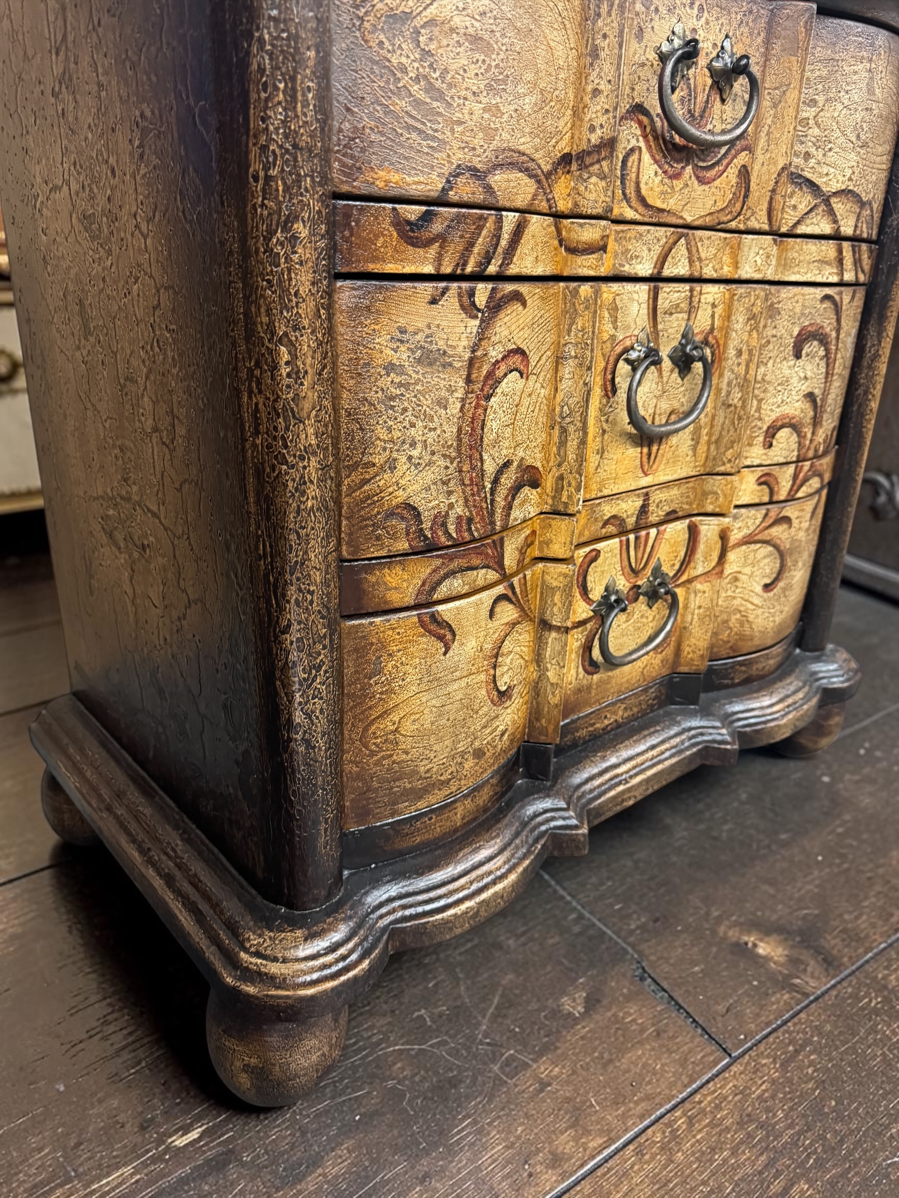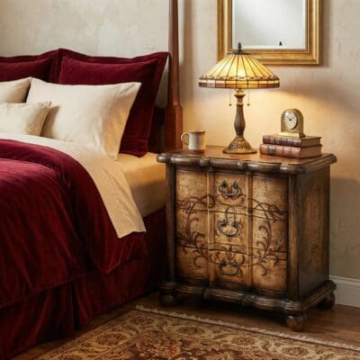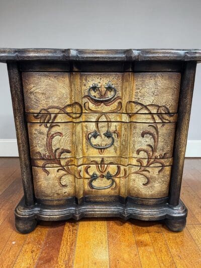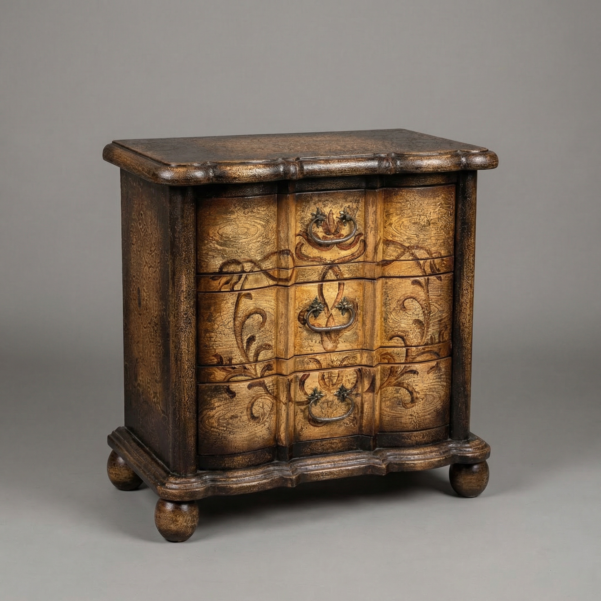 The Bellissimo Nightstand in Tuscany finish brings warmth, elegance, and artisan character to the bedroom. Handcrafted with a graceful curved front, turned feet, and antique-inspired hardware, this piece features a richly layered finish with soft creams, warm caramel tones, and hand-applied designs in a sage-rich reddish color. The result is a bedside table with beautiful depth, old-world charm, and a collected, timeless feel.