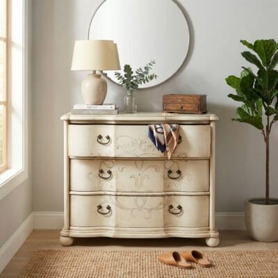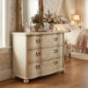 This elegant tall dresser brings timeless charm and practical storage to the bedroom. Handcrafted with graceful curved drawer fronts, delicate carved detailing, and a softly distressed finish, it offers a refined look that feels both warm and inviting. Its gentle antique-inspired styling makes it a beautiful fit for French country, shabby chic, cottage, farmhouse, and traditional interiors.
