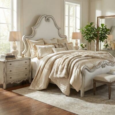 The Celine Wood Upholstered King Bed exudes classic elegance with its French-inspired design and luxurious detailing. The bed features a beautifully upholstered, tufted headboard framed by intricately carved wood, offering a refined yet inviting feel to your bedroom. Its gracefully curved silhouette and soft fabric make this bed a stunning centerpiece, blending sophistication with comfort. Crafted from high-quality materials, the Celine Bed is designed to elevate your space and provide a serene, stylish retreat.