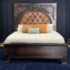 At the center of its design is a button-tufted leather headboard, offering both visual depth and luxurious comfort. Framed by ornate carved wood, the leather upholstery adds warmth and sophistication, evoking the romance of historic European estates and classic Spanish hacienda interiors.