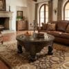 Elevate your living room with this Round Wrought Iron Coffee Table, featuring a hand-forged iron base with intricate scrollwork and a richly finished top. The artisan detailing and bold round design make it a true statement piece for rustic, traditional, or luxury interiors.