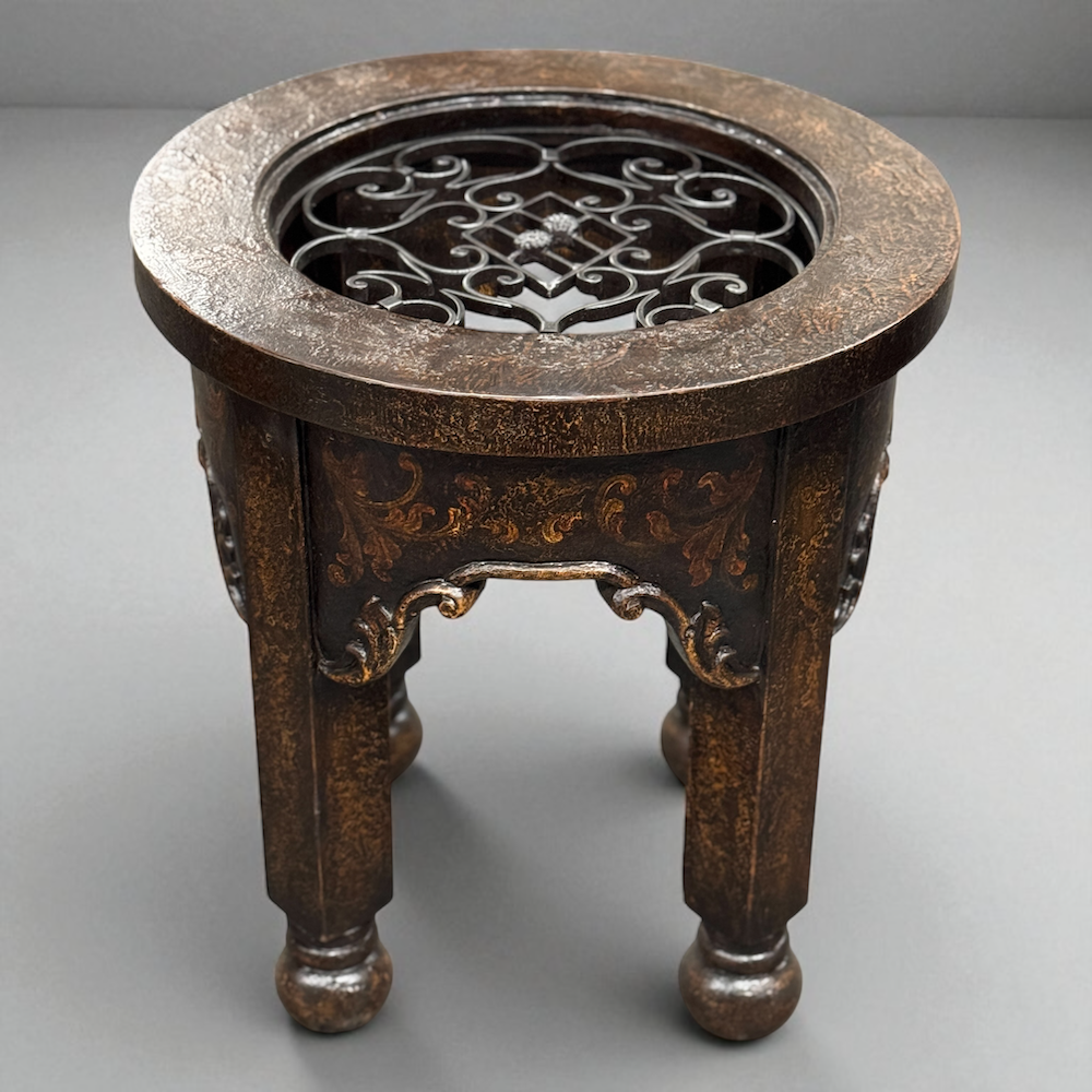 Its solid wood frame is finished with a rich, textured patina, highlighting the handcrafted character that makes each piece unique. Perfect as an end table, side table, or accent piece, this design complements rustic, traditional, and luxury interiors, making it a versatile addition to your home décor.