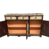 Designed for both style and function, this sideboard includes three spacious drawers for organizing cutlery, linens, or small essentials, while the three-door cabinet opens to reveal ample interior shelving, perfect for storing dinnerware, books, or decorative pieces. Its distressed patina and antique-style metal hardware make it an eye-catching statement piece for any dining room, living room, or entryway.