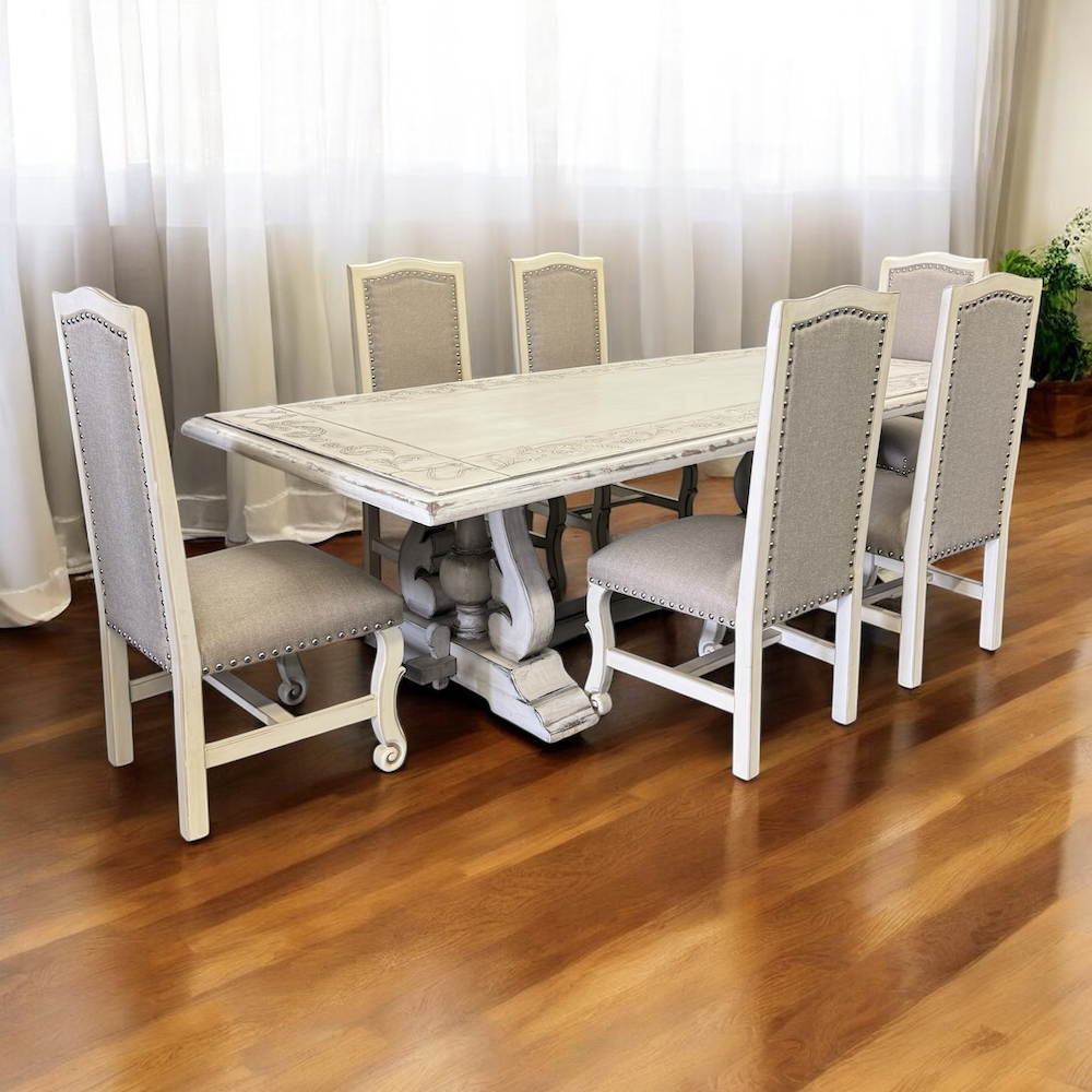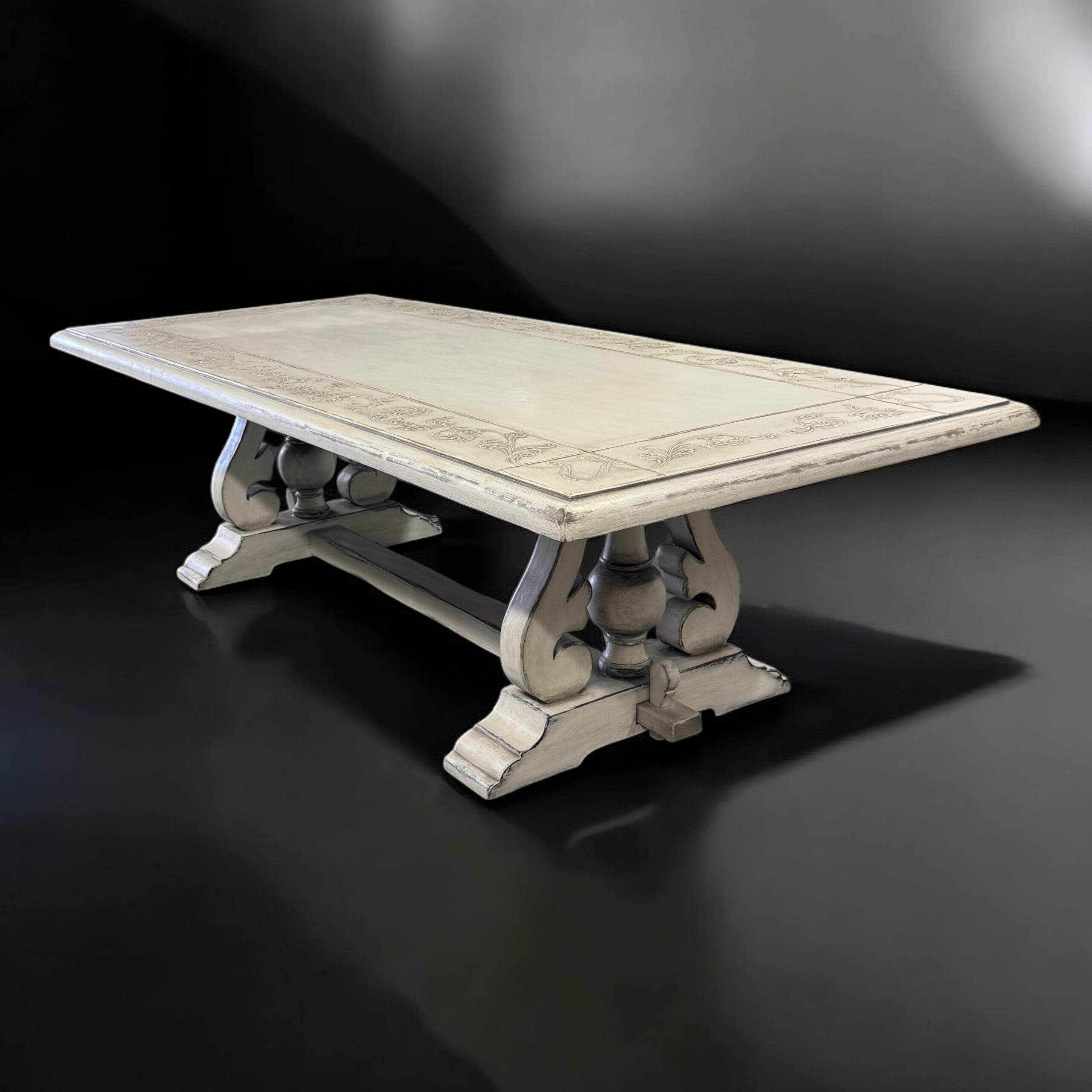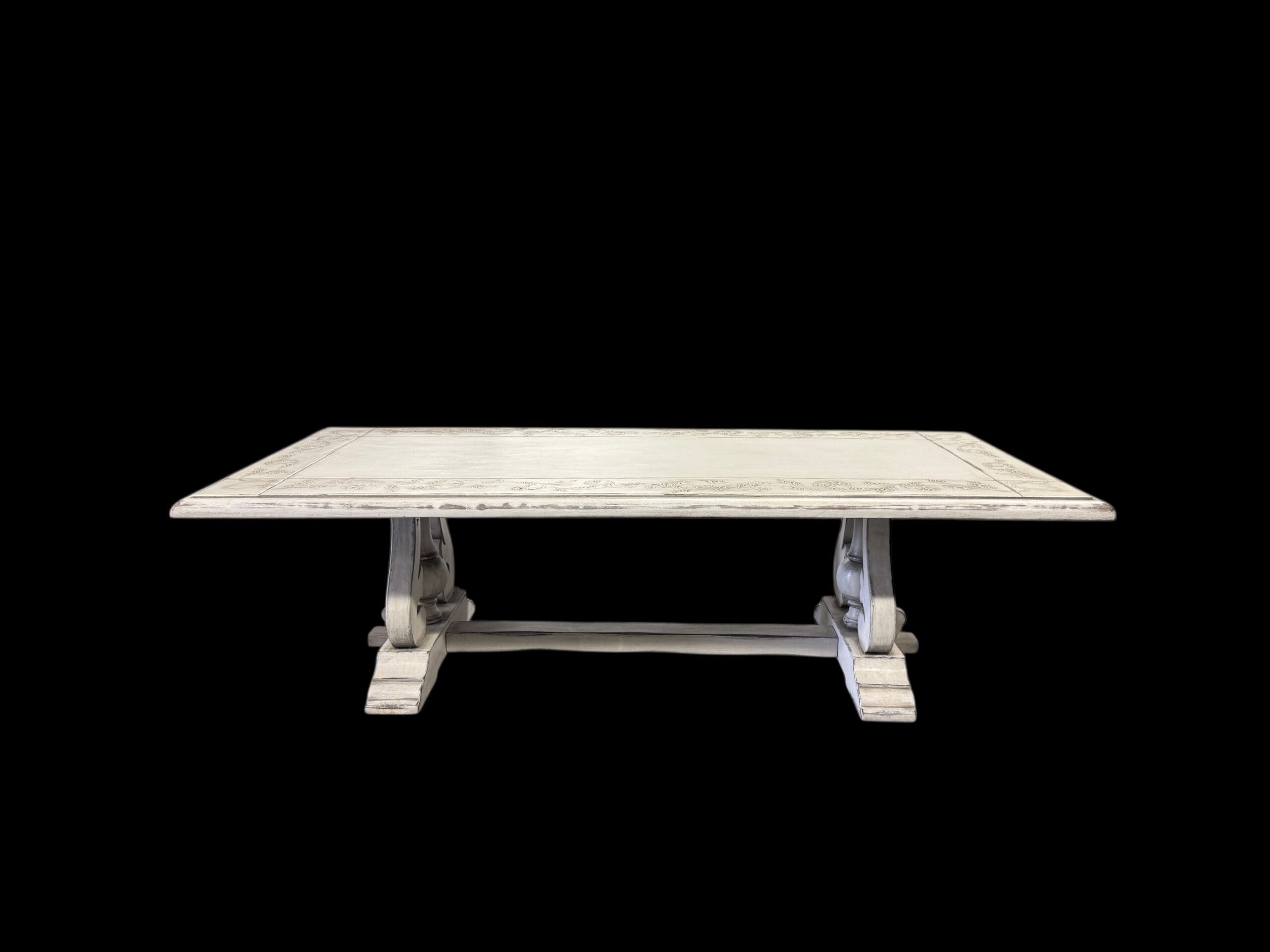 Elevate your dining experience with the stunning Magnolia Trestle Dining Table. Expertly handcrafted in Peru, this exquisite piece features a distressed, hand-painted finish that exudes rustic charm while maintaining timeless elegance. The intricately carved trestle base adds a touch of classic sophistication, making it a standout centerpiece for any dining room.