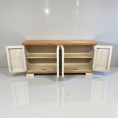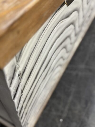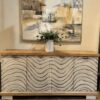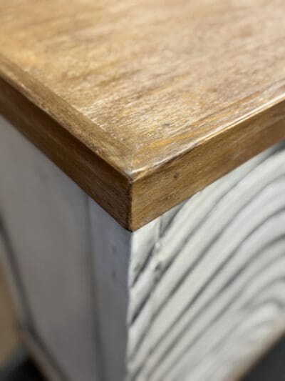 Bring texture and movement into your home with this stunning handcrafted buffet. Each door features a sculpted wave pattern, hand-painted in distressed white tones for a dimensional, organic feel. The natural wood top and base add warmth and contrast, making this sideboard ideal for coastal, modern rustic, or contemporary interiors.
