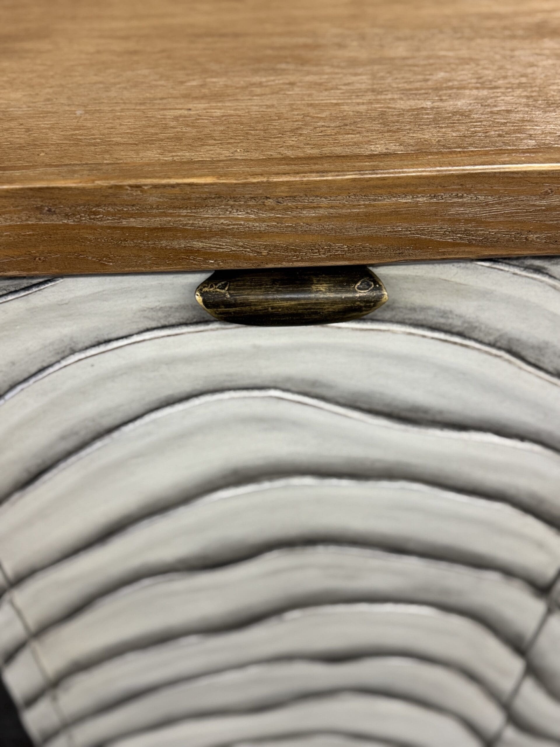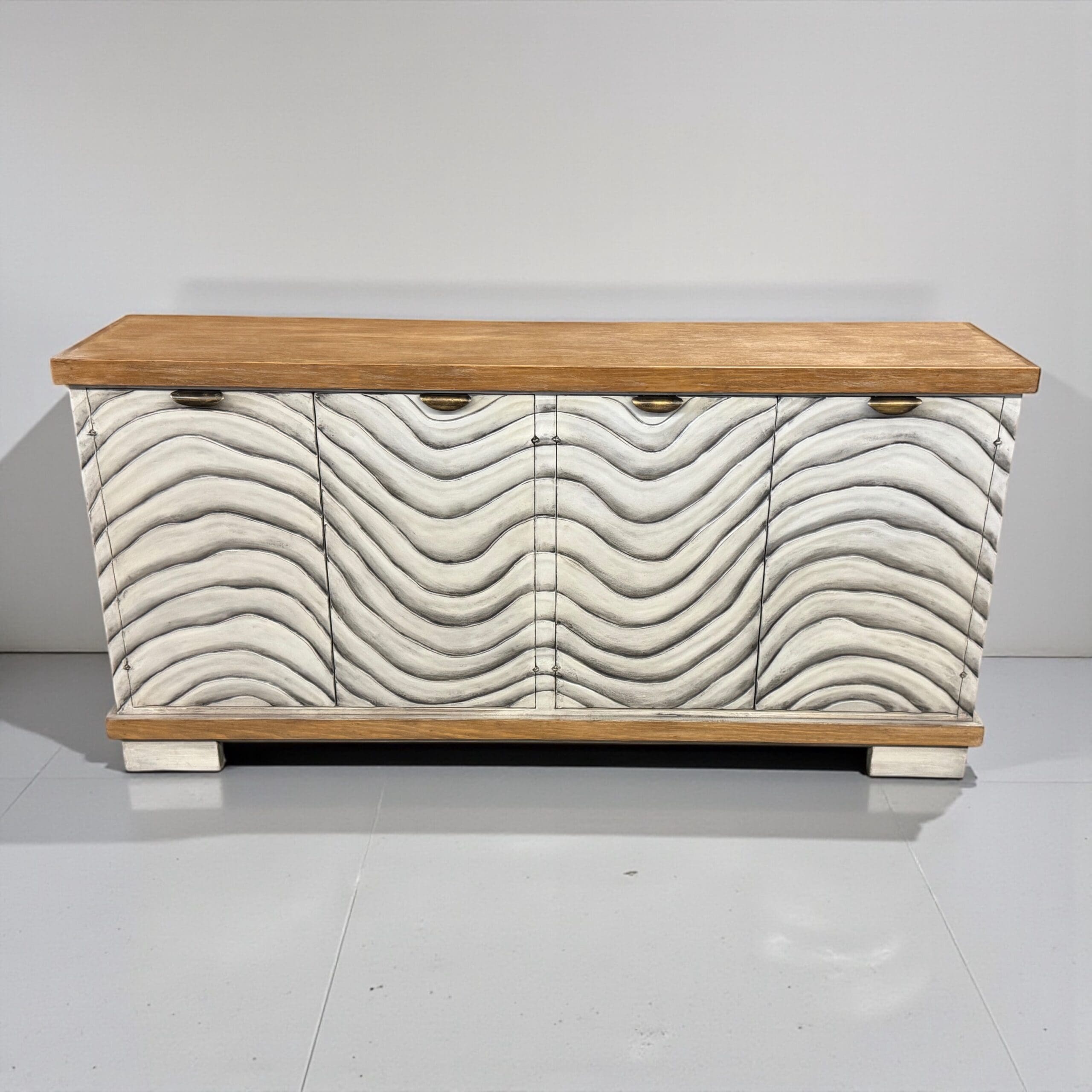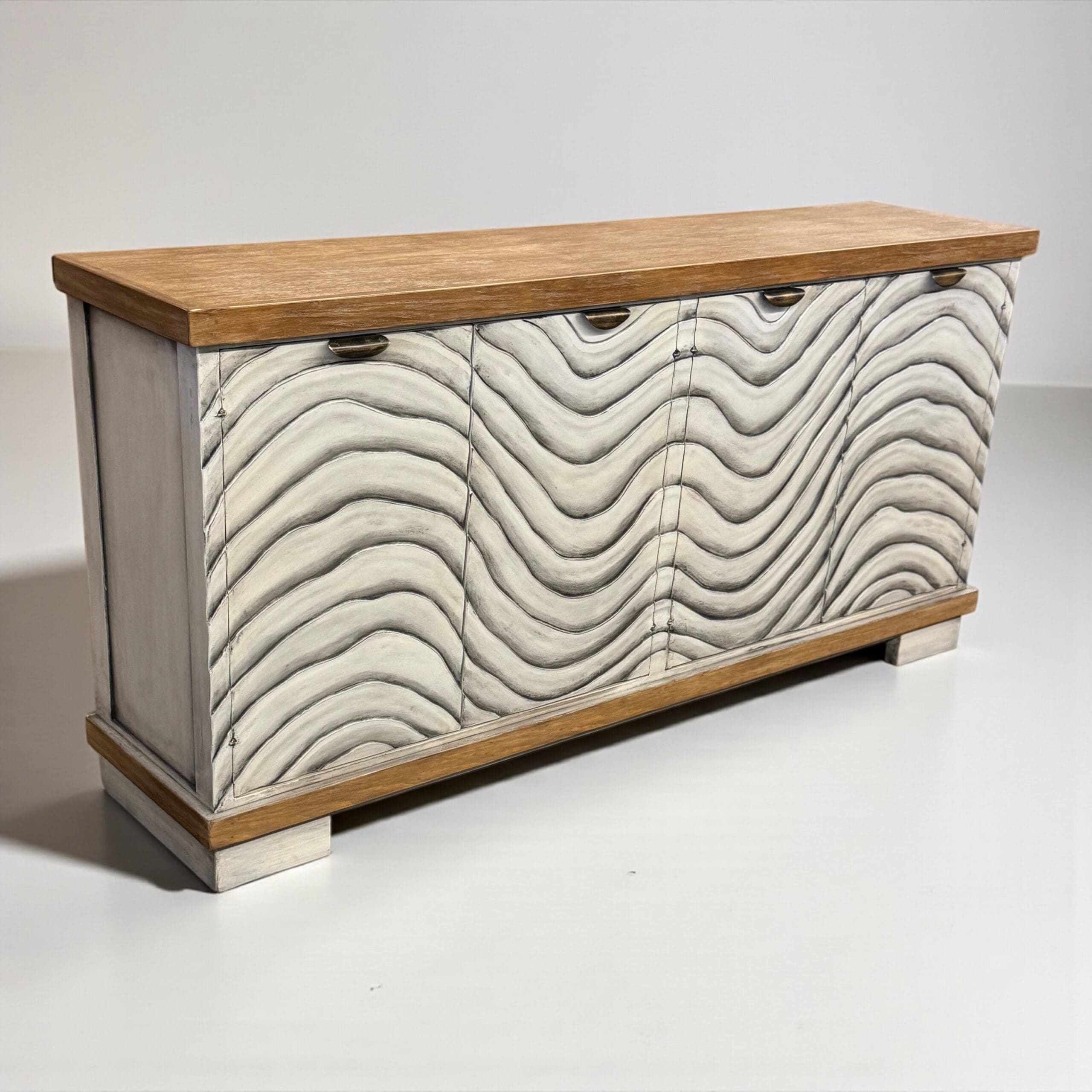 Bring texture and movement into your home with this stunning handcrafted buffet. Each door features a sculpted wave pattern, hand-painted in distressed white tones for a dimensional, organic feel. The natural wood top and base add warmth and contrast, making this sideboard ideal for coastal, modern rustic, or contemporary interiors.