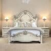 The finish of the bed is a distressed, silver-gray tone that enhances the intricate carvings, giving the piece an antique look that feels both luxurious and timeworn. The footboard mirrors the headboard’s design, with matching carvings and a similar arched shape, creating a cohesive and harmonious look.