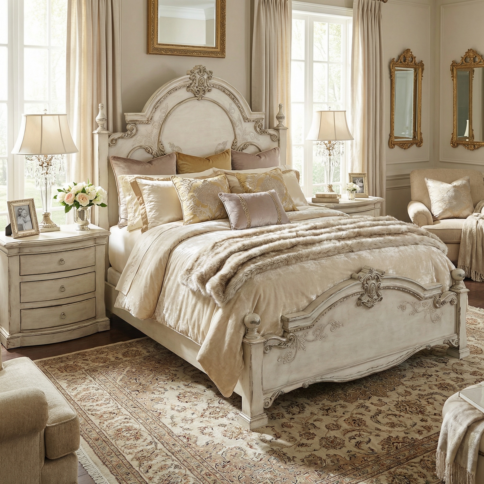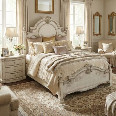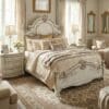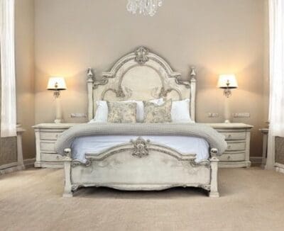 The bed’s posts are topped with finials, adding a touch of classic elegance to the overall design. The combination of the intricate details, the distressed finish, and the grand scale of the bed makes it a statement piece that would dominate any bedroom, particularly one with a classic, vintage, or European-inspired decor.