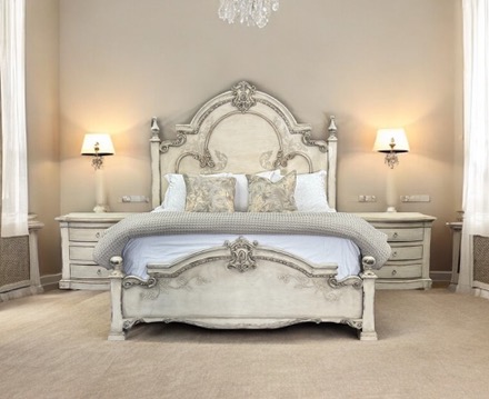 This bed is a magnificent piece of furniture, characterized by its ornate design and aged, Waxed off white finish.