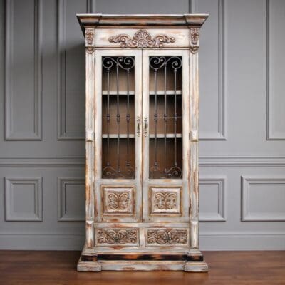 Its double doors are accented with hand-forged wrought-iron panels, adding texture, depth, and architectural interest while allowing a glimpse into the spacious interior shelving. The softly distressed finish highlights the natural grain and carvings, ensuring each piece has its own unique character and patina.