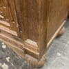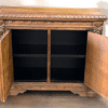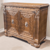 Crafted from solid wood, the chest has a warm, hand-finished patina that enhances the natural grain and depth of the material. The two cabinet doors, adorned with ornamental metal accents, open to reveal ample storage space with a dual-shelf interior, ensuring both form and function. The scrolled bun feet and rope-carved edgework add a regal touch, making this chest a standout piece for entryways, living rooms, or dining spaces.