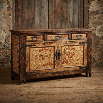 Bring timeless charm and artisanal craftsmanship into your home with this handcrafted rustic wood sideboard, featuring a rich natural caramel finish that undergoes a 7-step finishing process for depth, texture, and an authentic aged patina. Carefully designed with traditional hand-painting techniques, this stunning buffet cabinet showcases intricate detailing, distressed edges, and antique-inspired metal hardware for a truly vintage aesthetic.