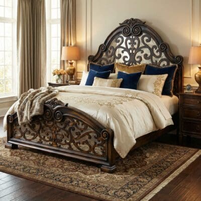 The Raquel Bed in Santander finish is a dramatic statement piece that brings warmth, texture, and timeless elegance to the bedroom. Handcrafted with a richly carved wood frame, this bed features an ornate arched headboard and coordinating footboard detailed with scrolling motifs that create a refined, romantic silhouette. The Santander finish adds depth and richness with its textured brown tones, giving the bed a warm, luxurious presence that works beautifully in sophisticated interiors.
