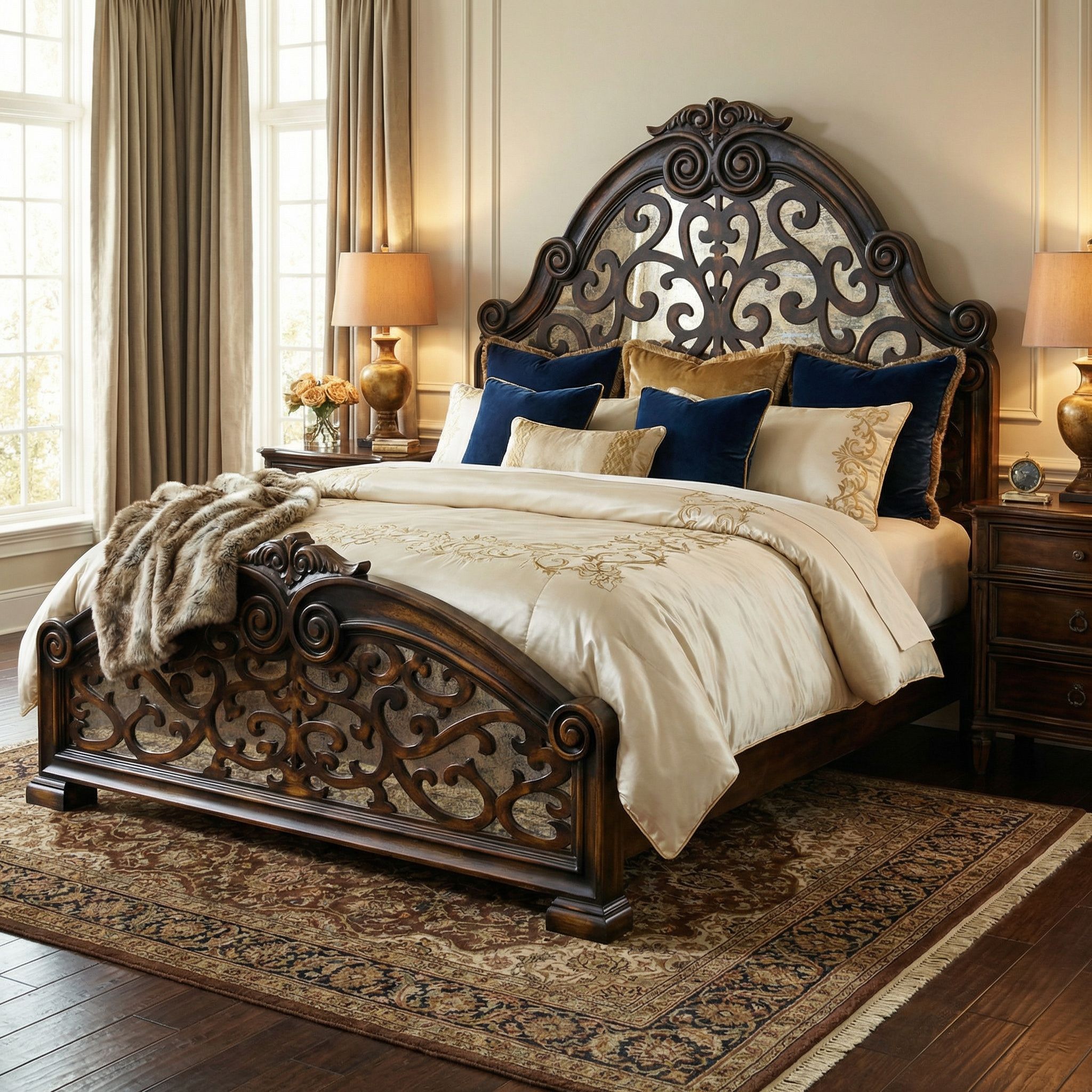 Both the headboard and footboard feature antique glass panels with decorative wood appliquรฉs, adding subtle shimmer and layered character to the design. Crafted with wood construction, some wood veneers may be used in certain areas to achieve the refined shaping and detailed finish of the piece. The Raquel Bed is a beautiful choice for traditional, rustic luxury, Spanish, Tuscan, and elegant transitional bedrooms, offering a handcrafted focal point that feels substantial, distinctive, and timeless.