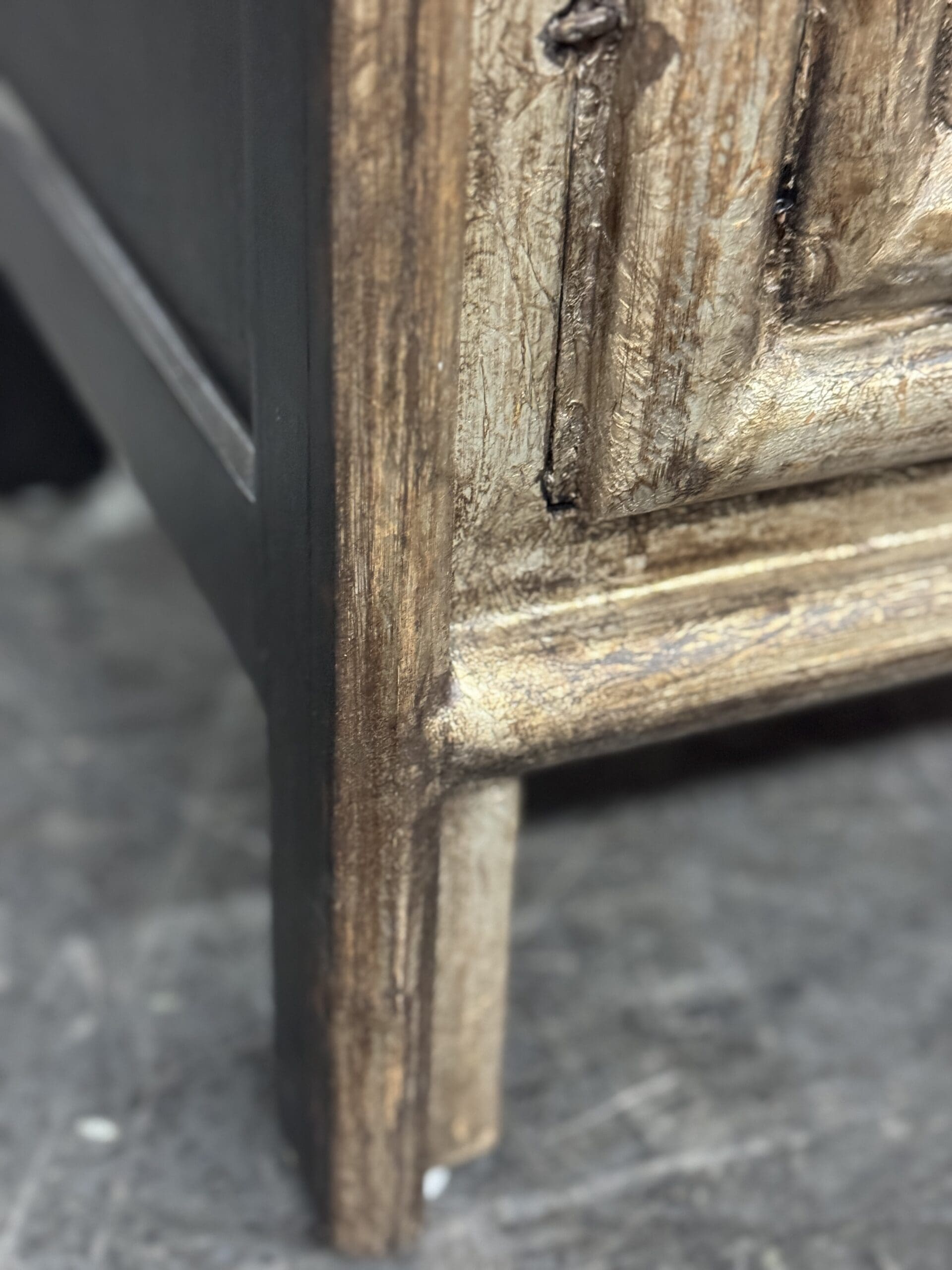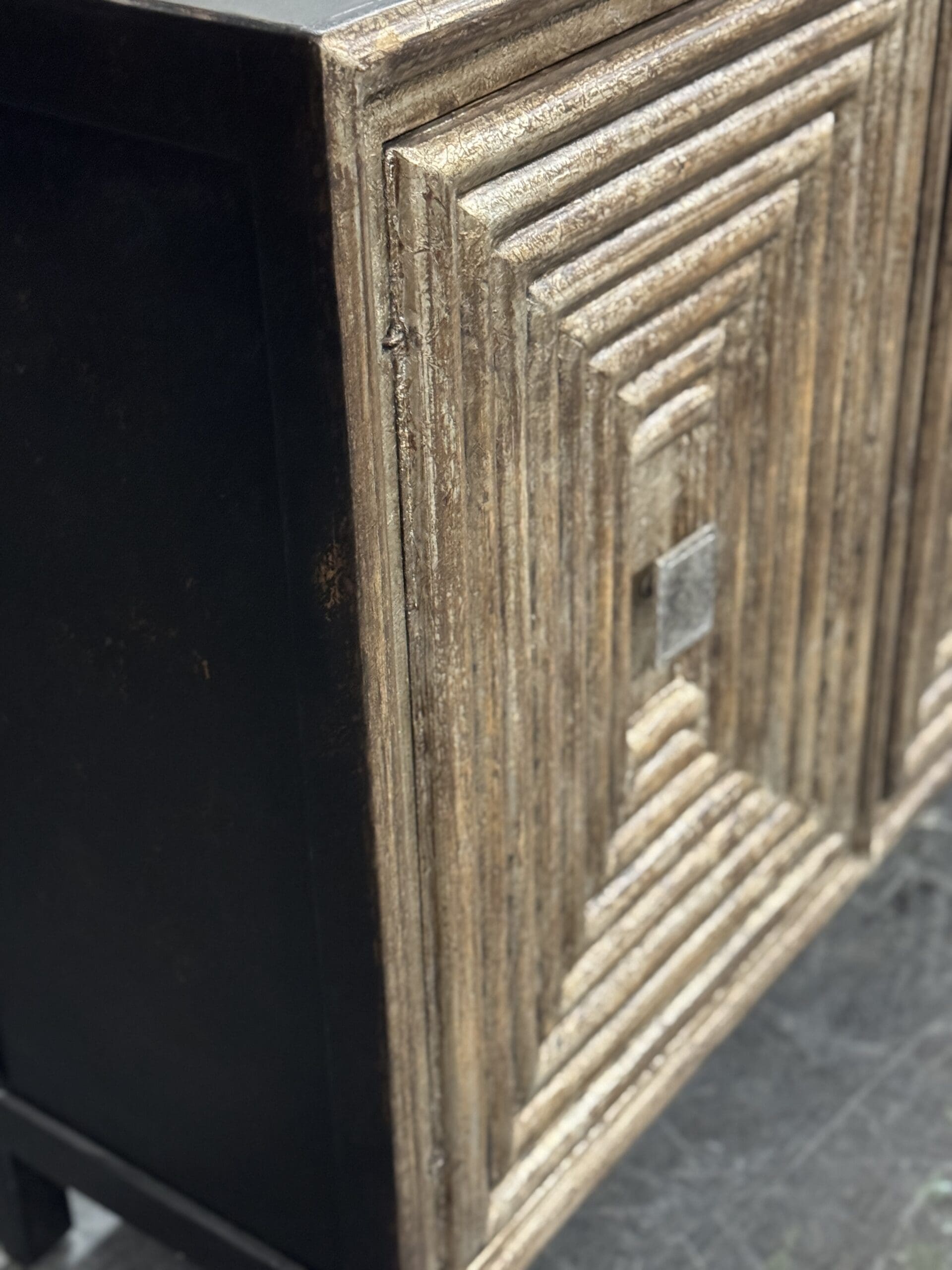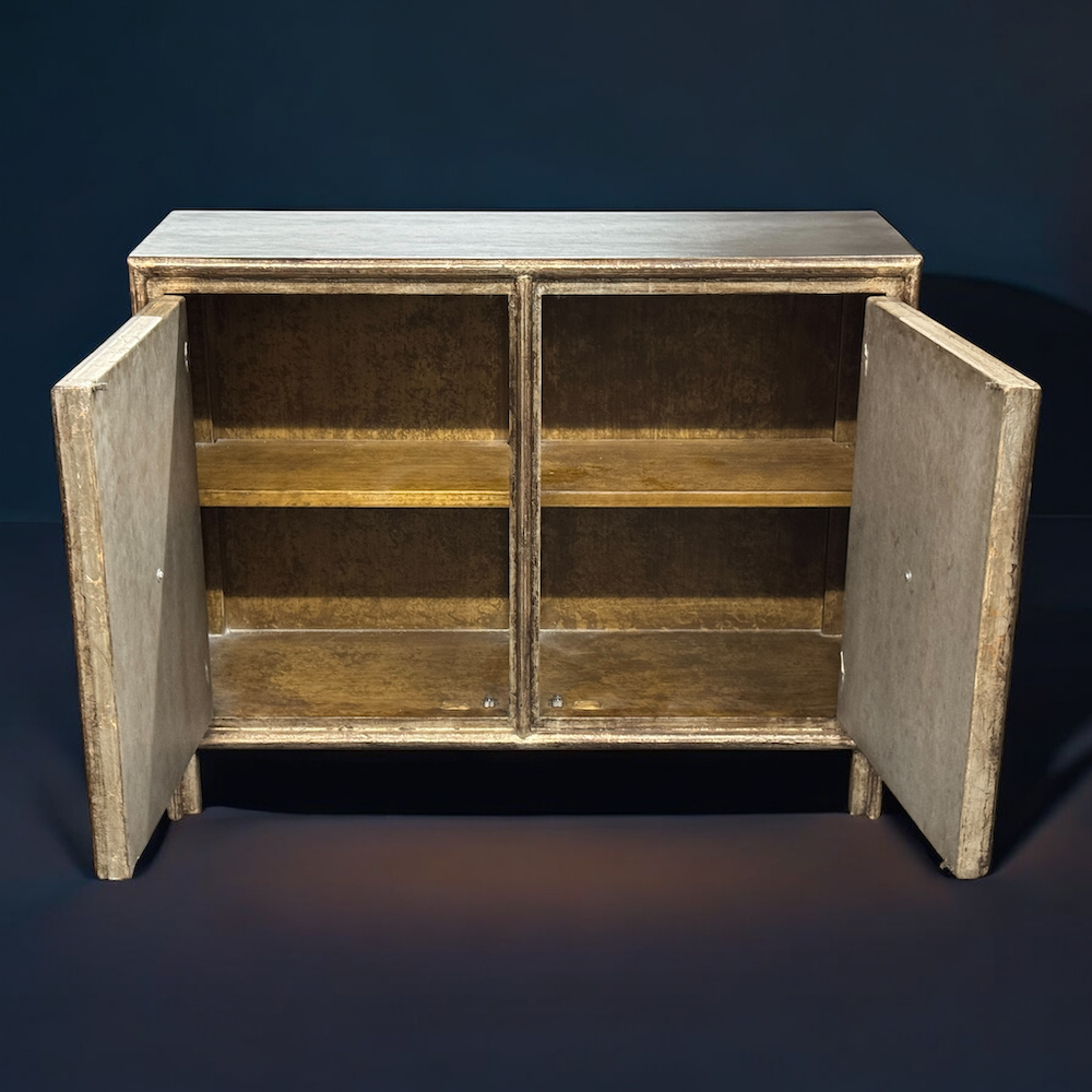 Add bold sophistication to your home with the Rocco Chest, a stunning handcrafted cabinet that blends luxury, modern rustic style, and artisan craftsmanship. Featuring a hand-applied silver leaf finish with copper distressing, this solid wood storage cabinet brings warmth, texture, and rich metallic tones into any space.