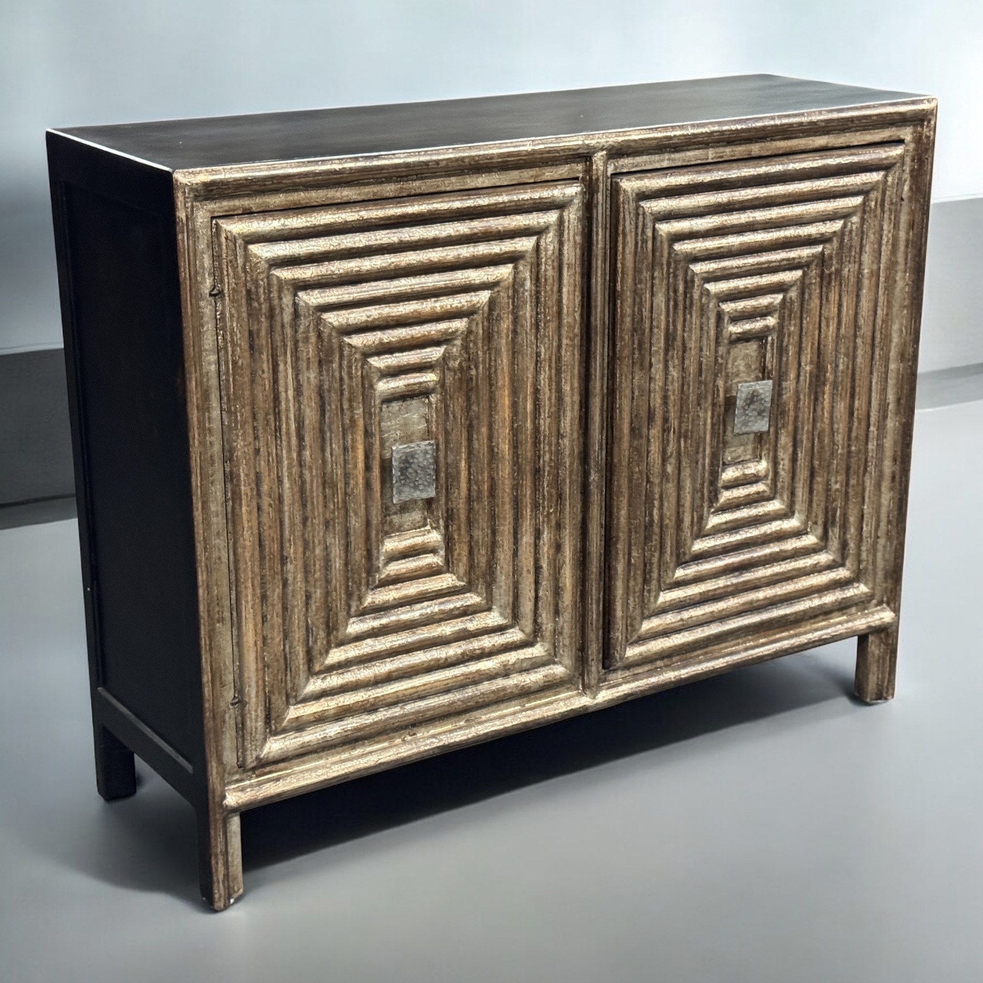 The geometric carved doors create a captivating 3D visual effect, making this chest a true statement piece for entryways, living rooms, dining rooms, or bedrooms. Inside, adjustable shelves provide practical storage, while the sleek silhouette offers a versatile design that complements modern, rustic, transitional, western, and eclectic interiors.