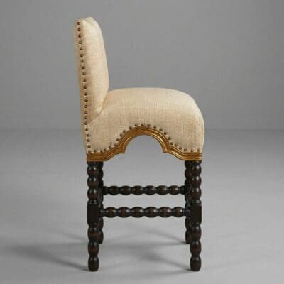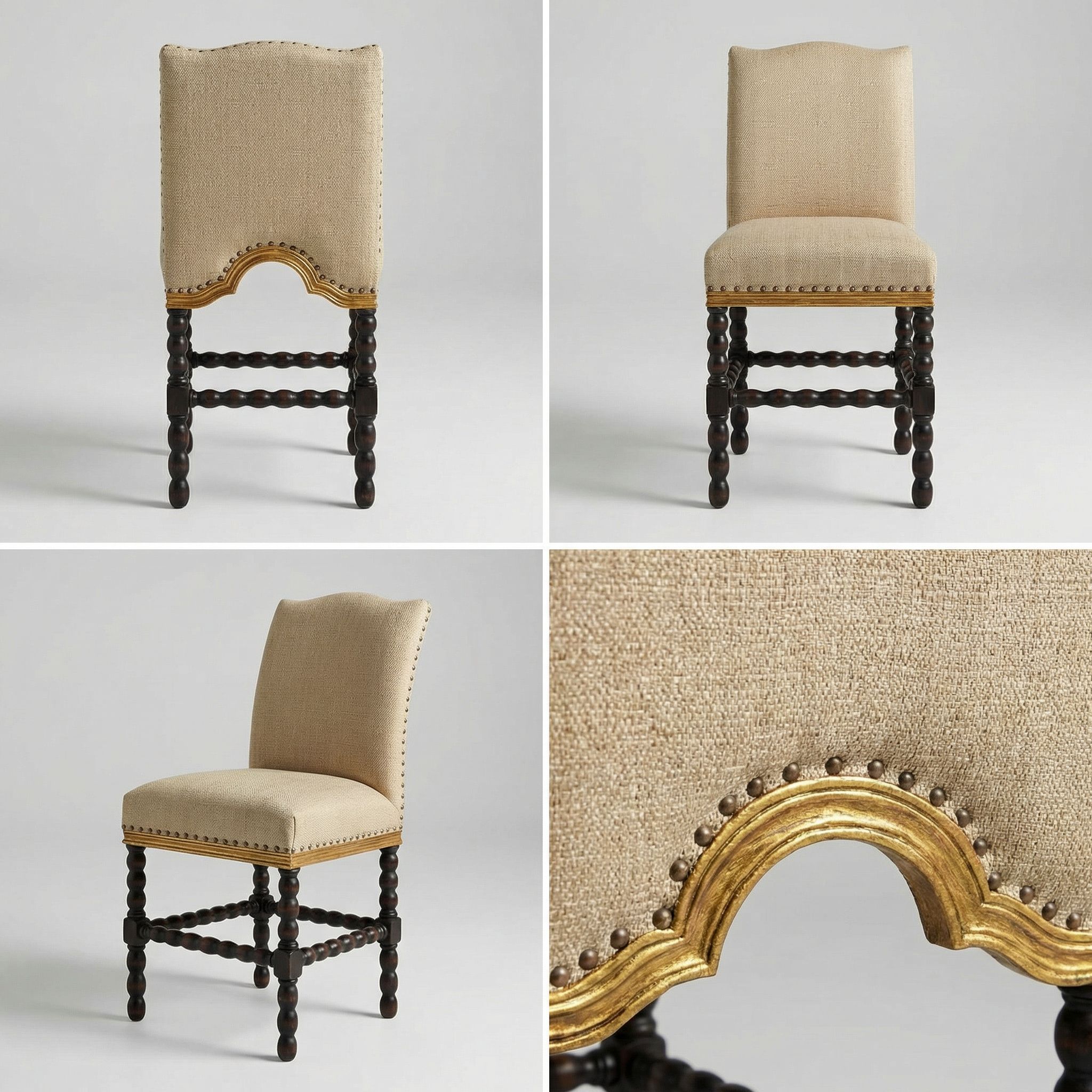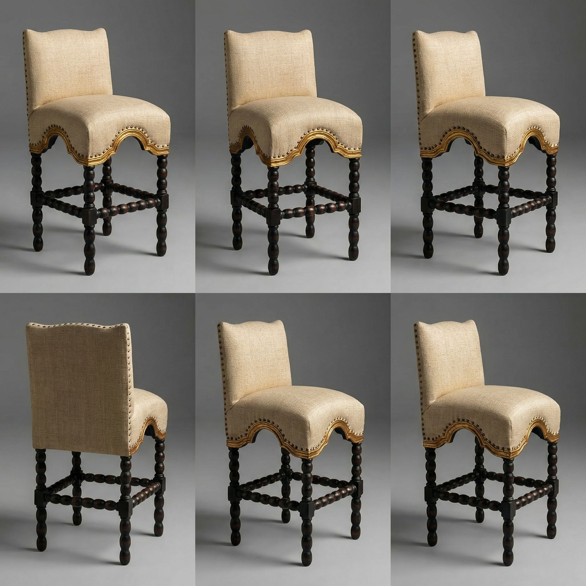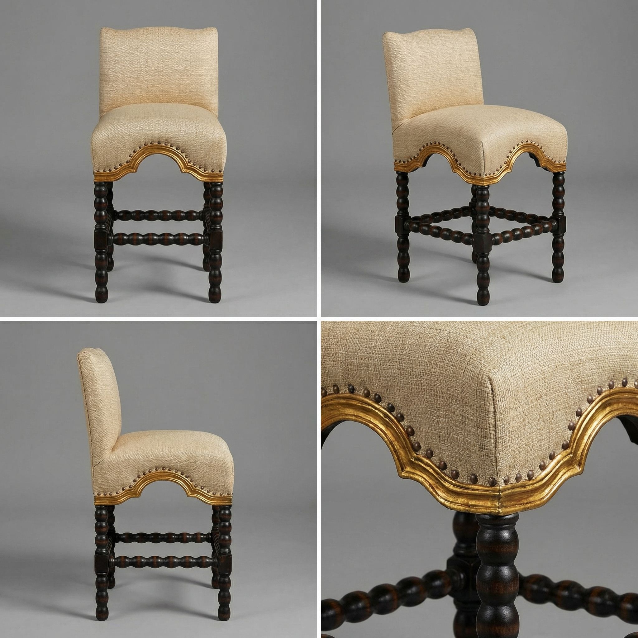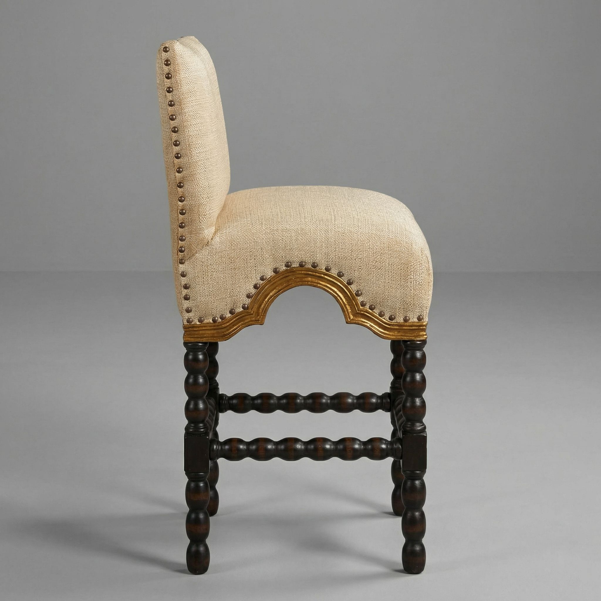 Add character and elegance to your kitchen or bar area with the Salomon Bar Stool. This beautifully crafted stool features a graceful silhouette with a curved apron finished in a rich gold accent, paired with turned wood legs in a dark finish for striking contrast. The upholstered seat and back are covered in a textured neutral fabric, trimmed with decorative nailheads that add a refined designer touch.