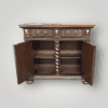Add timeless elegance to your home with this antique-style narrow wood console cabinet, perfect for hallways, entryways, or as a stylish storage solution in any room. Crafted from solid wood with a rich dark walnut finish, this ornate storage chest features intricately carved twisted columns, diamond-panel cabinet doors, and vintage-style metal drawer pulls. The two spacious drawers provide convenient storage for small essentials, while the double-door cabinet opens to reveal interior shelving for organizing books, linens, or decorative pieces.