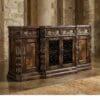 The San Antonio Buffet is a striking statement piece that blends old-world craftsmanship with modern functionality. Handcrafted from solid wood, this 99-inch wide buffet features intricate carvings, ornate metal scrollwork, and a richly distressed finish with golden accents. Its spacious design includes four drawers for storing dining essentials and generous cabinet space behind elegantly detailed doors, making it both beautiful and practical. The dramatic antique look makes it ideal for traditional, rustic, or Mediterranean-inspired interiors, adding a touch of luxury to any space.