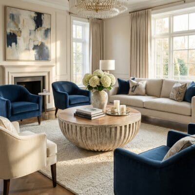 The combination of natural wood tones with the elegant silver leaf base makes this table a perfect statement piece for modern, eclectic, or transitional interiors. Its round shape and low profile would make it an ideal coffee table in a living room, providing both functionality and a refined artistic touch.