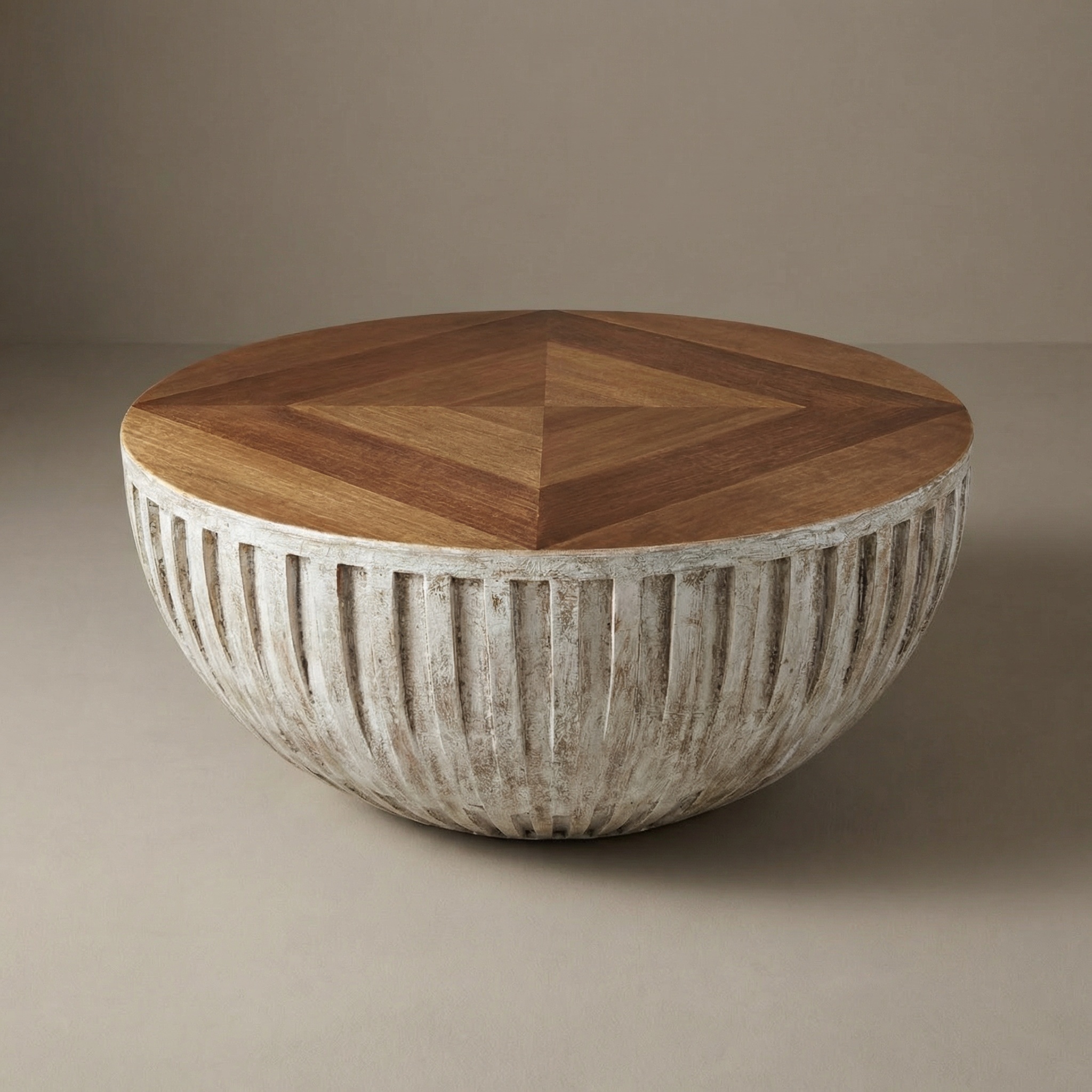 Our Selva Coffee table a beautifully designed piece with a round shape and a striking combination of textures and finishes. The tabletop features a geometric, parquet-style pattern made of light wood, arranged in a triangular design that draws attention to the center. This wood finish has a warm, natural tone, giving the table a modern yet earthy appeal.