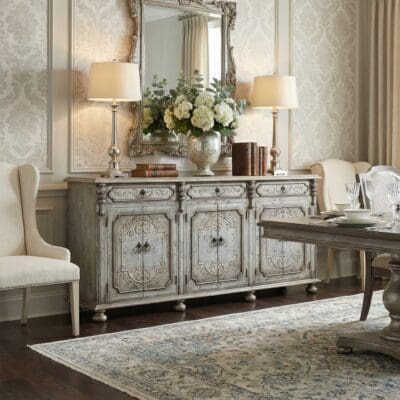 Finished in Rustic Plata, the Large Tammy Buffet boasts silver hues with subtle black undertones, adding depth and richness to its appearance. The exquisite scrolls in cream delicately adorn the surface, enhancing its aesthetic appeal with a touch of timeless elegance.